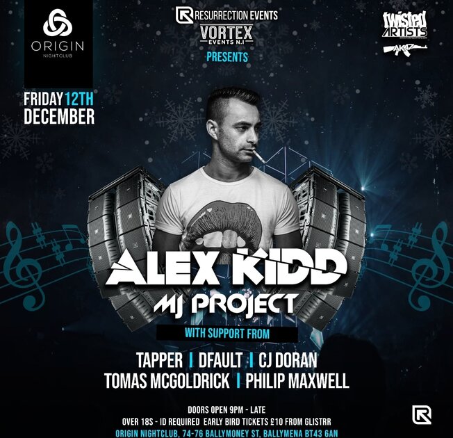 Vortex and Resurrection Events have teamed up once again, providing a night with higher tempo & harder bass as none other than the one and only DJ Alex Kidd takes to the booth live and direct from Origin Night Club, this is surely one headline DJ not to be missed. Known for his fast pace, hard bass freestyle mixing that always brings the atmosphere all clubbers and ravers require. Supporting this AK47 event alongside the 'Kidd' is a fantastic variety of Northern Irelands finest DJs DFAULT, TOMAS MCGOLDRICK PHILIP MAXWELL, TAPPER, CJ DORAN and for added measure the brilliant excentric MJ PROCJECT makes his Northern Ireland debut. Earlybird tickets on sale now.